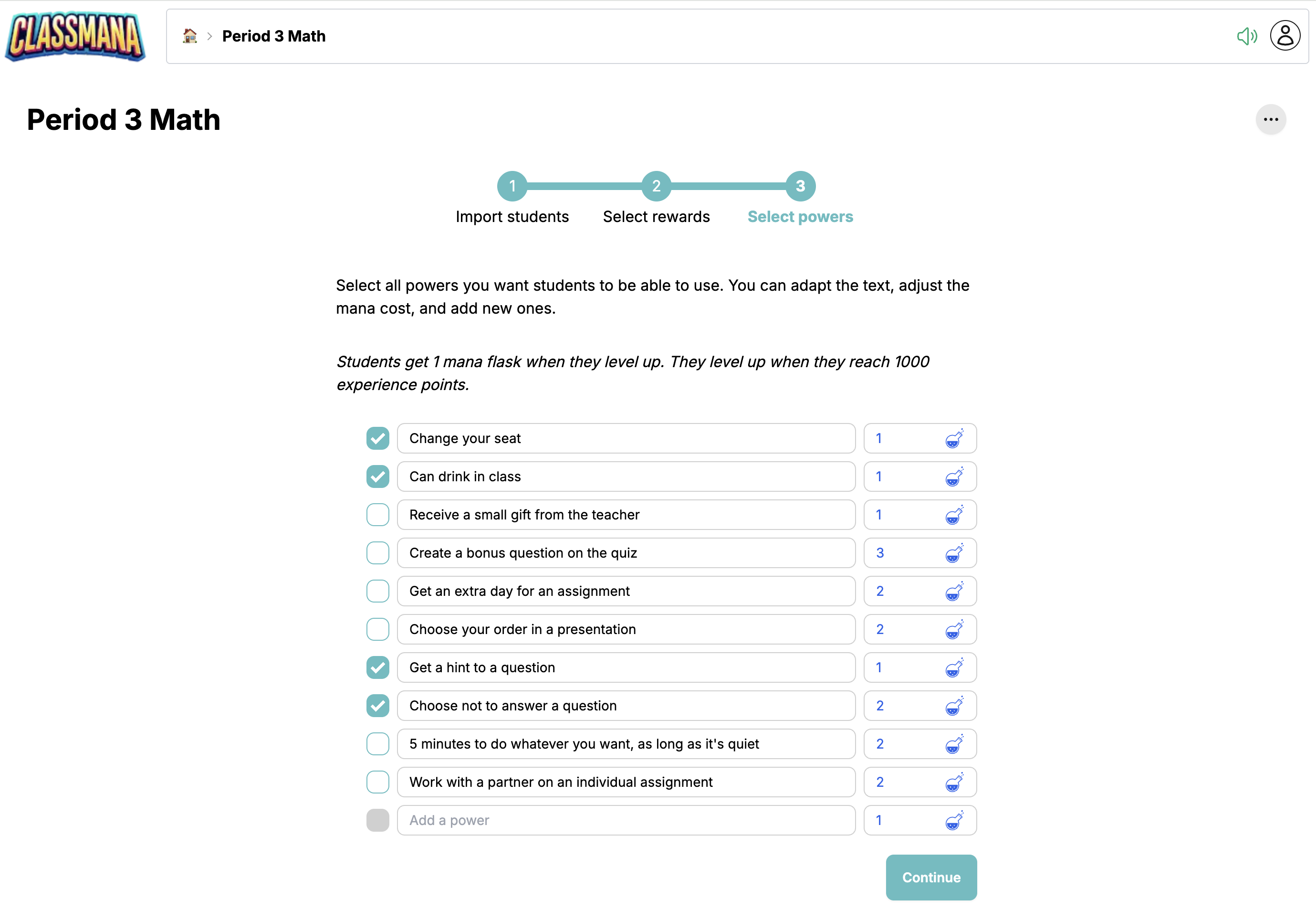 Efter att ha skapat din klass kommer du att gå igenom en 3-stegs installationsguide för att konfigurera elever, belöningar och krafter.