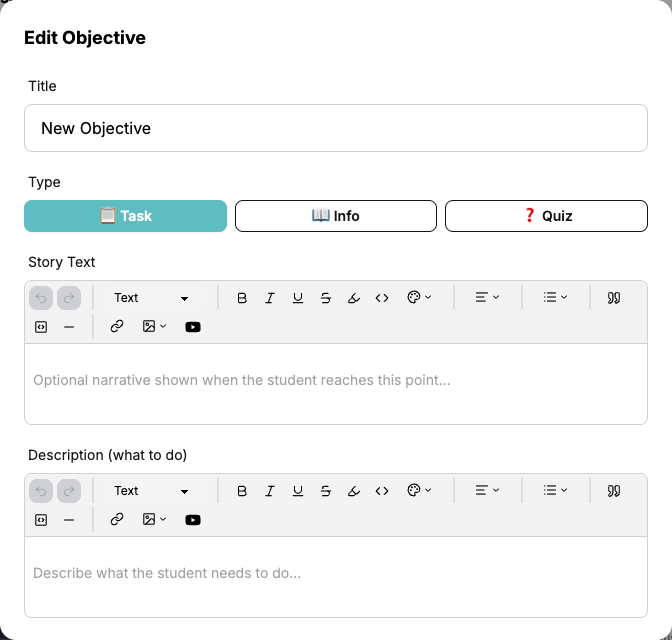 Questmål använder en riktextredigerare för fälten Berättelsetext och Beskrivning. Detta låter dig gå bortom vanlig text — lägg till formatering, bilder, länkar och till och med YouTube-videor för att göra dina quester mer engagerande.